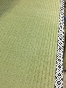 九条紋の畳縁で浄土真宗のお寺の難しい畳の製作 高難易度製作・有職畳 2015.05.262025.02.03浄土真宗の庫裏の新築工事のために九条紋で畳を作ってます〜!これ普通の紋ヘリよりだいぶ難しいんです。筋無しの縁の裁断も目がチカチカしますし(笑)筋無しという幅広い紋縁からサイズ、場所、向きを考慮して裁断してから使ってます。これを一手間も2手間もかけて畳の寸法に合わせてから縫い付けていきますよー!お寺というと畳が同じ向きに全て引き込まれているのをイメージするかもしれませんが、こちらは庫裏ということもあり通常の8畳間の廻し敷きをします。敷き込む難易度はさらに高いということになります。