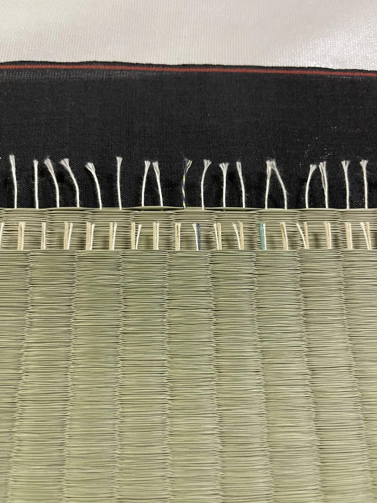 端っこに見える青や黄色の色糸。これ、ただの飾りじゃないんです。 「県証糸(けんしょうし)」といって、「熊本県八代産」であることの証明書。偽造を防ぎ、産地の品質を保証する、まさに「本物の証」なんです。